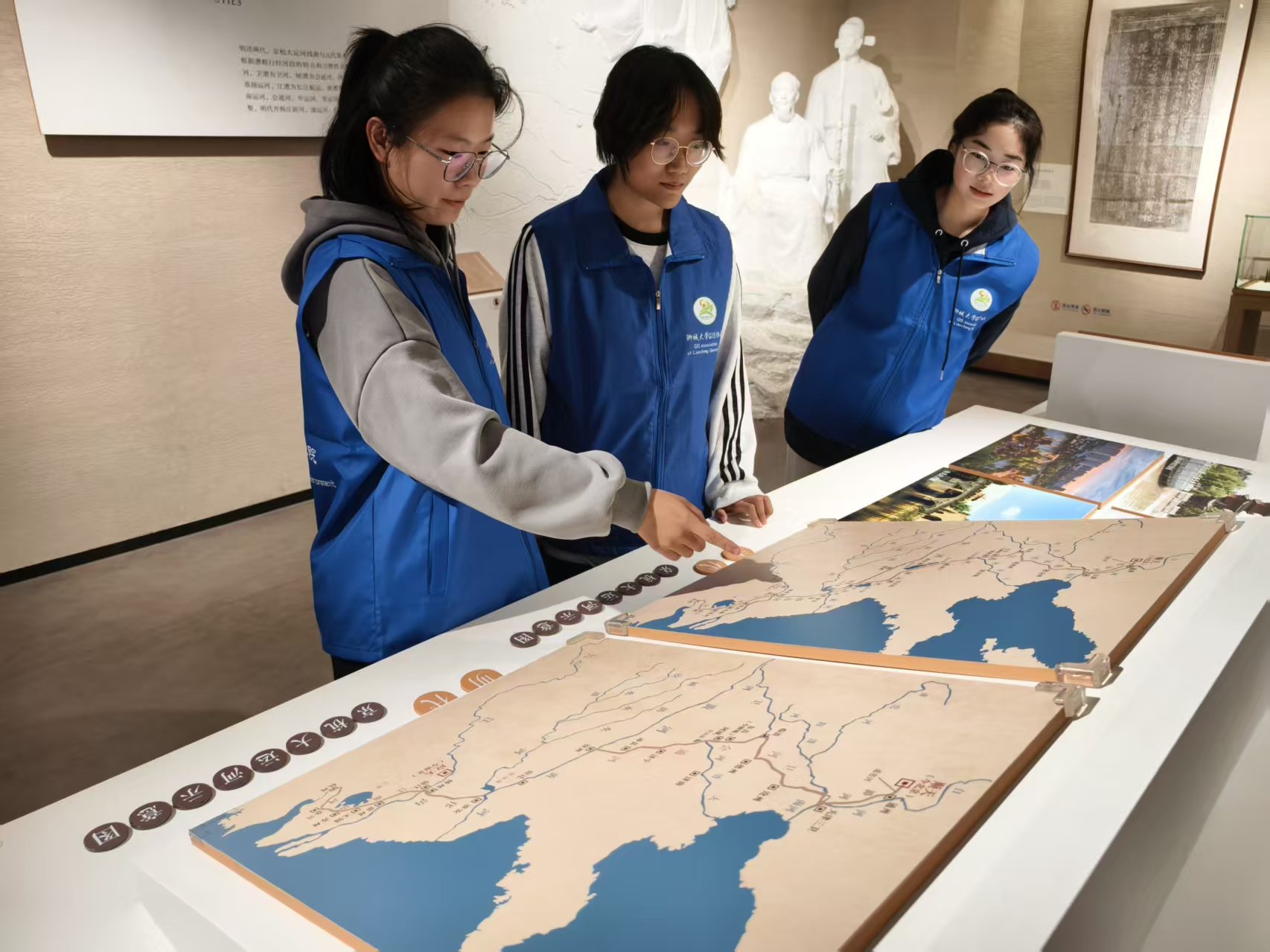 在馆内多媒体互动区域,同学们借助触摸查询屏自主检索信息,并在运河微缩模型前驻足研讨,从宏观视角系统把握了古运河工程的整体布局与构造细节。同学们参与了运河航线模拟航行体验,通过沉浸式互动直观感受古代航运的川流不息与沿岸市井的繁荣景象。多样化的展示形式与互动体验打破了时空限制,让千年运河的历史魅力鲜活地呈现在大家眼前。
