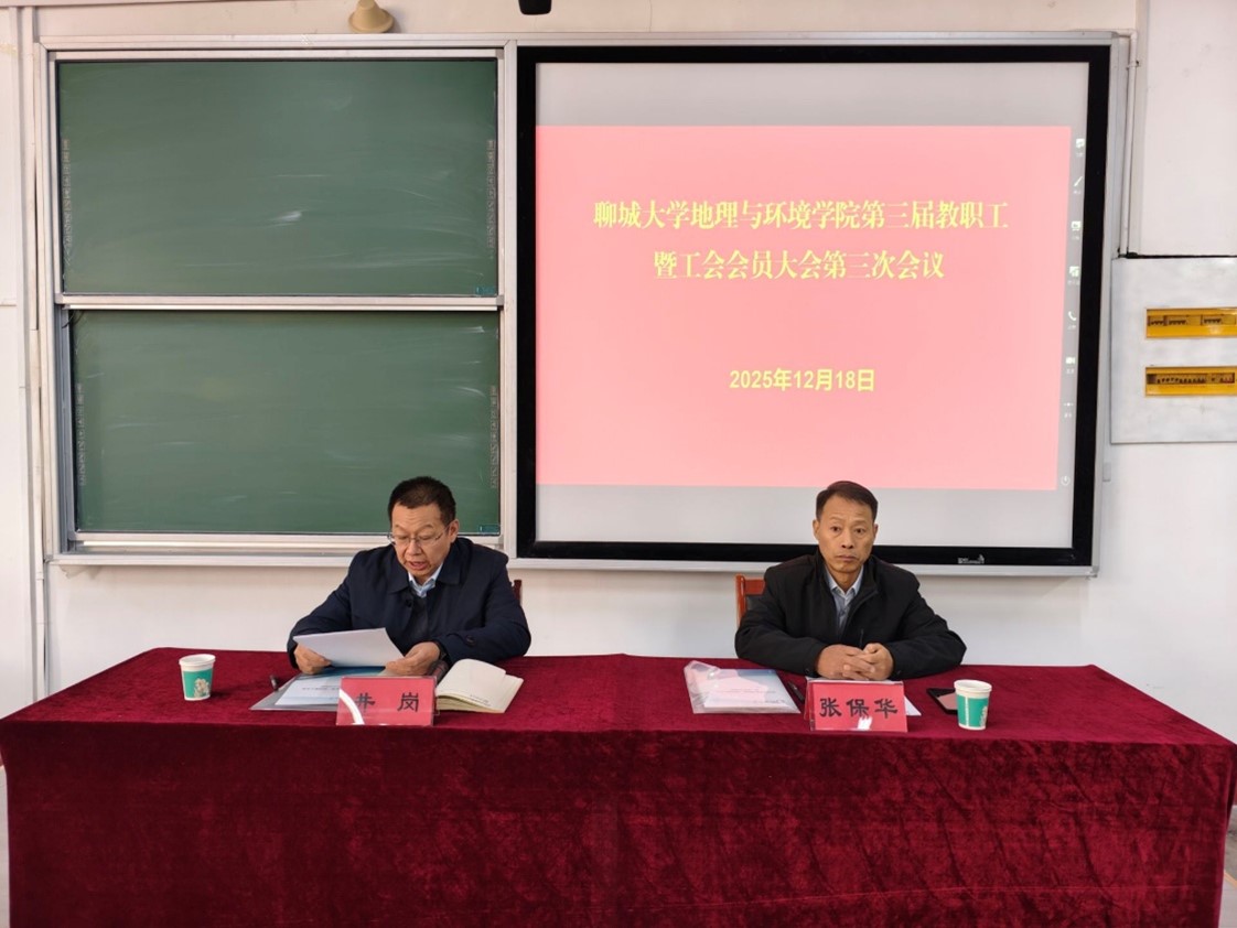 2025年12月18日,聊城大学地理与环境学院第三届教职工暨工会会员大会第三次会议于东校区4#A201隆重召开,会议由学院党委书记井岗主持,学院领导班子及全体教职工参加本次会议。会议圆满完成各项议程,听取并审议通过了学院工作报告和工会工作报告,为学院未来发展凝聚了共识、指明了方向。